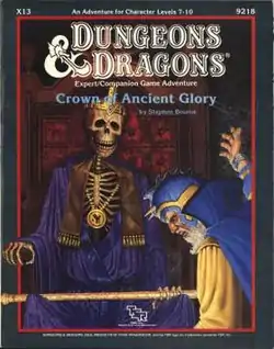 Crown of Ancient Glory is an adventure module for the Dungeons & Dragons fantasy role-playing game. It was published by TSR in 1987, and designed by Stephen Bourne. Its cover art is by Keith Parkinson, with interior art by Chris Miller and cartography by Dave S. LaForce. The module's associated code is X13 and its TSR product code is TSR 9218. This module was developed and intended for use with the Dungeons & Dragons Expert Set and Companion Set rules.