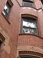 The Crowninshield House stands at the southwest corner of Marlborough and Dartmouth Street. It is a four-story brick building, featuring a variety of trim in black brick, brownstone, and decorative green and blue tiles. It has a mansard roof, and a projecting two-story entrance section at the center of the main facade. The entry is flanked by sidelight windows and sheltered by a semicircular wrought iron hood.[2]