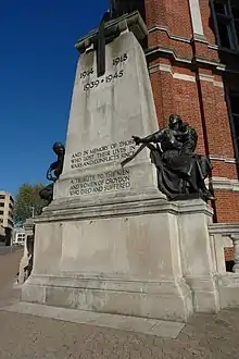 It is framed by two bronze statues of seated figures by Paul Raphael Montford, cast at the M. Maneti foundry.[2] One depicts a soldier of the East Surrey Regiment, dressing his own wounded arm; the other a woman holding a child in her left arm and a letter in her outstretched right hand: her distress is evident, and "[w]e must presume that the news of her husband's perhaps fatal wounds has just reached her".[1][3][4] The figure of the soldier was exhibited at the Royal Academy in 1921.[3]