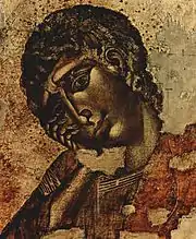 Representations of the Virgin and John the Evangelist flank Christ in small rectangular panels at either end of his outstretched arms. Both are dark-skinned, and bear agonised and sorrowful expressions as they rest their heads on their hands and face inwards towards Christ. In keeping with the Franciscan idea, the gilding surrounding the mourning saints is kept to a minimum. The size and positions of the figures are reduced compared to usual Byzantine iconography[4] to maintain sole focus on the passion of Christ.[20]