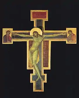 The Crucifix by Cimabue at Santa Croce (c. 1265) is a very large wooden crucifix, painted in distemper, attributed to the Florentine painter and mosaicist Cimabue, one of two large crucifixes attributed to him.[1] The work was commissioned by the Franciscan friars of Santa Croce and is built from a complex arrangement of five main and eight ancillary timber boards. It is one of the first Italian artworks to break from the late medieval Byzantine style and is renowned for its technical innovations and humanistic iconography.