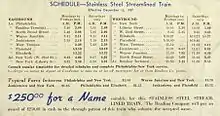 A contest was held to find a name for the new train, offering a $250 cash prize (equivalent to $5,089 in 2022) to the winner. The Crusader, the entry of Mr. P. W. Silzer of Plainfield, New Jersey, won the prize, selected by a committee of 29 railroad officials from among 6,086 suggestions.[5] The Crusader's first regular run was on December 13, 1937.[2] The train was scheduled to make two round trips six days a week; Sundays were reserved for maintenance work.