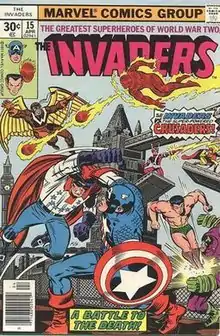 The Crusaders battle World War II superhero team the Invaders on the cover of The Invaders #15 (April 1977). Art by Jack Kirby.