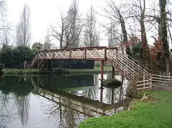 Crusoe Bridge is a footbridge over the River Cam in Cambridge, England. It is the fourth bridge over the Cam in the city, and is the last footbridge on its upper upstream in Cambridge.[1] It connects Coe Fen with Sheep's Green, the wooden deck is on 4 steel piers.[2][3] The bridge name is derived from the nearby 'Robinson Crusoe Island'.[4]