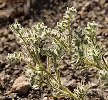 It is an annual herb producing a branching stem 10 to 35 centimeters tall covered in stiff hairs. The hairy to bristly leaves are up to 4 centimeters long. The inflorescence is a linear array of developing fruits with a dense clump of open flowers at the tip. The bristly white five-lobed flowers are 3 or 4 millimeters wide.