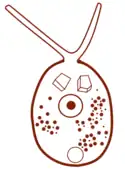 Cryptodifflugia leachi is characterized by an oval, elliptical shell with a circular transverse section and a smooth surface. The shell ranks as one of the smallest out of the testate amoebae, with a length of 10-16 μm, a width of 8-12 μm and a very small pseudostomal aperture of 1.5-2.5 μm in diameter.[2][1] Its pseudopodia are narrow and cylindrical, often reaching lengths up to 3 times that of the shell. Inside its cytoplasm there are often one or two large crystal-like refractive bodies in the anterior (closer to the aperture) region. When encysted, it develops an operculum, a thickened plug, and the cell membrane thickens behind it.[2]