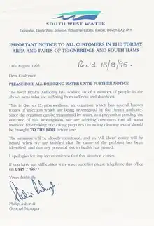 - ↑ "Boil water warning 'precaution'". BBC News. 2 September 2008.