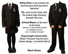 Culcheth High School's uniform consists of a black blazer embroidered with the school badge, a plain white school shirt, the school clip-on tie and black shoes. Black trousers for the boys, and black logo skirt or plain trousers for the girls. The school's badge holds the traditional eagle, that the school adopted when it first opened in 1931, with a modern look. The school tie is black, with an eagle and two blue stripes.