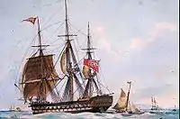 On 7 August 1805, HMS Blenheim, Captain Austin Bissell and Rear-Admiral Thomas Troubridge, was escorting a fleet of East Indiamen consisting of Castle Eden, Cumberland, Devonshire, Dorsetshire, Exeter, Ganges, Hope, and Preston. They were at 19°3′S 17°15′E / 19.050°S 17.250°E when they encountered the French ship of the line Marengo and frigate Belle Poule. There was a brief exchange of fire before both sides sailed on. Troubridge reprimanded the captains of Cumberland and Preston for having acted too boldly in exchanging fire with the French.[5][6]