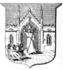 A second shield was also recorded, based on the city's counterseal. This consisted of a temple, with St Nicholas standing in the doorway praying over a cauldron of boiling children. This was blazoned: azure, a temple argent, St Nicholas standing in the porch, mitred and vested proper, with his dexter hand lifted up to heaven praying over three children in a boiling cauldron of the first, and holding in the sinister a crosier or.