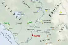 Cures was an ancient Sabine town between the left bank of the Tiber and the Via Salaria, about 26 miles (42 km) from Rome, in central Italy. Its remains are located in the modern commune of Fara Sabina. According to legend, it was from Cures that Titus Tatius led to the Quirinal the Sabine settlers, from whom, after their union with the settlers on the Palatine, the whole Roman people took the name Quirites.[1] Another legend, related by Dionysius,[2] connects the foundation of Cures with the worship of the Sabine god Quirinus, whence Quirites.