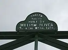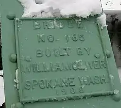This is the second bridge since 1901 to span the Kettle River at this spot. Originally used for a ferry crossing by the native tribes of the area, a cable ferry had been built in 1897 and washed away in the floods of 1898. To replace the ferry, a "Corduroy" bridge constructed from logs was erected in 1901. When the log bridge was destroyed by flood waters, bids were taken to replace the bridge in 1907. The contract was awarded to William Oliver for $7,975, and construction was completed in 1908. This was the No. 165 bridge built by William Oliver.[3]