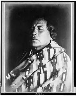 Ashishishe was born in approximately 1856 in Montana Territory, the son of Strong Bear (Inside the Mouth) and Strikes By the Side of the Water. His name, variously rendered as Ashishishe, Shishi'esh, etc., has been said to literally mean "the crow",[1] however, this may be a misunderstanding as the Crow word for "crow" is "áalihte".[2] Ashishishe may be a transliteration of the word "shísshia", which means "curly".[3] His death record lists his name as being "Bull Half White (Curly)".[4] He resided on the Crow Reservation in the vicinity of Pryor Creek, and married Bird Woman. He enlisted in the U.S. Army as an Indian scout on April 10, 1876. He served with the 7th Cavalry Regiment under George Armstrong Custer, and was with them at the Battle of Little Bighorn in June of that year, along with five other Crow warrior/scouts: White Man Runs Him, Goes Ahead, Hairy Moccasin, his cousin White Swan, and Half Yellow Face, the leader of the scouts. Custer had divided his force into four separate detachments, keeping a total of 210 men with him. Half Yellow Face and White Swan fought alongside the soldiers of Reno's detachment, and White Swan was severely wounded. Curly, Hairy Moccasin, Goes Ahead and White Man Runs Him went with Custer's detachment, but did not actively participate in the battle; they later reported they were ordered away before the intense fighting began. Curly separated from White Man Runs Him, Hairy Moccasin, and Goes Ahead, and he watched the battle between the Sioux/Cheyenne forces and Custer's detachment from a distance. Seeing the complete extermination of Custer's detachment, he rode off to report the news.[1]