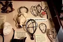 In 1890, Schimmelbusch invented a mask for the delivery of anaesthetics to surgical patients. It was primarily designed for ether anaesthesia, but he also proposed its use for chloroform anaesthesia.[1] Both ether and chloroform can cause irritation if they come into contact with the patient's skin, so Schimmelbusch designed a metal mask, over which a gauze could be stretched and secured. The mask was placed over the patient's mouth and nose, and anaesthetic was applied to the gauze, allowing the patient to inhale the anaesthetic as they breathed normally. Around the edge of the mask, a trough collected the residual anaesthetic, rather than allowing it to drip onto the patient's face.[2]