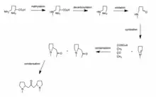 Ornithine is methylated to N-methylornithine and when decarboxylated, becomes N-methylputrescine. 4-methylaminobutanal is yielded from the oxidation of the primary amino-group. 4-methylaminobutanal then cyclizes to an N-methyl-l-pyrrolinium salt. The condensation of the pyrrolinium salt with acetoacetyl coenzyme A yields hygrine. Finally, the condensation of the hygrine molecule with another molecule of pyrrolidinium salt yields cuscohygrine.[1]