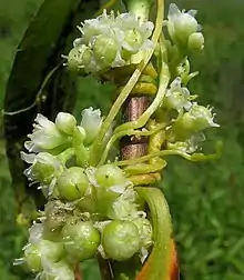 The annual parasitic twining herb or climber that is associated with many hosts. It blooms between November and March producing 5-merous[5] white-cream-yellow flowers[1] in compact clusters on pedicels which are less than 2.5 millimetres (0.1 in) long.[5] The lobes are rounded-triangular and shorter than or equal in length to the corolla tube.[5] It parasitises both native and exotic plants.[5] To maximize its seed yield, it synchronizes its flowering to that of its host plant via detection of a signaling protein in the host.[6]