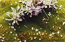 A cushion plant is a compact, low-growing, mat-forming plant that is found in alpine, subalpine, arctic, or subarctic environments around the world. The term "cushion" is usually applied to woody plants that grow as spreading mats, are limited in height above the ground (a few inches at most), have relatively large and deep tap roots, and have life histories adapted to slow growth in a nutrient-poor environment with delayed reproductivity and reproductive cycle adaptations.[1] The plant form is an example of parallel or convergent evolution with species from many different plant families on different continents converging on the same evolutionary adaptations to endure the harsh environmental conditions.[2]