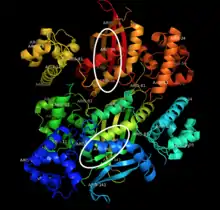 Connecting these two domains in the monomer is the single cysteine residue.[9] The disulfide bond links 156 amino acid units.[3] Forming the larger complexes of the pentamer and decamer requires the presence of cyanate, or a substrate analog like azide.[9] The final native enzyme complex is a complex of 5 dimers.[3]