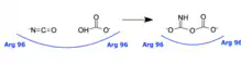 Cyanase enzyme catalyzes the reaction of bicarbonate and cyanate forming carbamate, to be rapidly decomposed into carbon dioxide and ammonia. The two adjacent anion binding sights signified by the catalytic Arg 96 residues on different monomers allow this reaction to occur in the pocket. Created on ChemDraw.