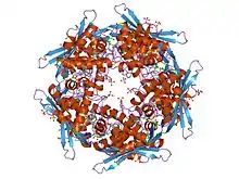 Some bacteria can overcome the toxicity of environmental cyanate by degrading it via this enzyme.[8] Cyanate hydratase is found in bacteria and plants. Cyanase is functionally active as a homodecamer, composed of 5 complexes of dimers. Each of these monomer subunits is 17 kDa and supports half-site binding of substrates.[6] The cyanase monomer is composed of two domains. The N-terminal domain shows structural similarity to the DNA-binding alpha-helix bundle motif. The C-terminal domain has an 'open fold' with no structural homology to other proteins. The dimer structure reveals the C-terminal domains to be intertwined, and a decamer is formed by a pentamer of these dimers. The active site of the enzyme is located between dimers and is composed of residues from four adjacent subunits of the homodecamer.[6]