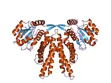 KaiB adopts an alpha-beta meander motif and is found to be a dimer or a tetramer.[2][5]