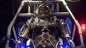 The producers noted there were a history of "sexy, pneumatic, hydraulic women" in science fiction, and wanted to "tap into that."[1] To make the cyberwoman costume, the props department wanted to make it as "sexy" as they can. Director James Strong wanted to make the costume look "amazing," but threatening and scary as well.[1] There were discussions about which parts of Lisa would be human, and which parts would be cyborg. Made out of rubber,[3] it was custom made to fit Chikezie as much as possible. It took an entire day for the actress to get her body cast. After the costume was completed, it would take an hour to apply each morning, and an hour to remove by lunch break. Chikezie found it difficult to hear anything from the helmet while shooting scenes.[2] It was also uncomfortable for her, but the producers noted she remained stoic throughout filming.[3]