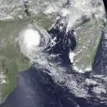On December 23, a tropical depression formed in the Mozambique Channel, accompanied by spiral rainbands toward the center.[7] That day, the system reached peak winds of 65 km/h (40 mph),[8] and the Madagascar Meteorological Service named it Alifredy. The storm moved quickly southeastward toward Madagascar. High pressures to the south prevented much development, and Alifredy moved ashore near Morondava in western Madagascar on December 24 at peak intensity. While crossing the island, the storm weakened into a tropical depression. Alifredy emerged into the open Indian Ocean and failed to restrengthen. It became extratropical and turned southeastward, dissipating on December 27 within the westerlies.[7][8] The JTWC did not track the storm.[2] Alifredy had little impacts on Madagascar; Morombe reported a peak wind gust of 56 km/h (35 mph).[7]