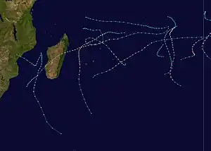 The 1985–86 South-West Indian Ocean cyclone season was the first in which the Météo-France office (MFR) on Réunion tracked cyclones as far east as 90° E in Indian Ocean, south of the equator. Previously, the agency's area of responsibility was limited to 80° E. It was an active season with twelve named storms, of which five strengthened into tropical cyclone with 10 minute sustained winds of at least 120 km/h (75 mph).[nb 1] The first named storm was Tropical Storm Alifredy, which originated in the Mozambique Channel in late December and moved across Madagascar. However, the unofficial Joint Typhoon Warning Center (JTWC) tracked a short-lived storm in September.