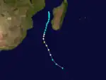 On February 18, a circulation formed in the Mozambique Channel, based on satellite imagery. That day, it developed into Moderate Tropical Storm Gista,[24][25] Early on February 19, the JTWC classified it as Tropical Cyclone 19S.[2] Gista moved generally southward, initially moving to the southeast toward western Madagascar and later curving to the southwest, bringing it within 100 km (60 mi) of the coast. The storm gradually intensified while moving away from the country, reaching peak 10 minute winds of 95 km/h (60 mph) on January 21 about 120 km (75 mi) east of Europa Island. According to the MFR, Gista became extratropical that night, although the JTWC continued tracking it for several more days. According to the JTWC, Gista intensified to the equivalent of a minimal hurricane on February 22 to the southwest of Madagascar, and the next day reached peak 1 minute winds of 160 km/h (100 mph). Gista accelerated to the southeast and dissipated late on February 24 in the westerlies.[24][25]