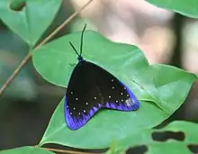 It disguises itself to resemble the spotted blue crow. It secretes liquid hydrogen cyanide through their legs as little droplets. Though unlike the butterfly, and so many other insects, Cyclosia midamia produces its own poison made out of the chemical compound cyanide.