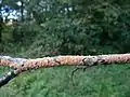 It is very common in Poland, usually found on various types of forests, bushes, parks, gardens, roadsides, trunks and branches of deciduous trees. It was found on the following species and types of trees: maples, chestnut tree, alder, silver birch, hornbeam, hazel, hawthorn, beech, hairy ash, apple, black poplar, plum tree, Robinia pseudoacacia, willow, and lime. It occurs rarely on conifers.[5]