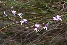 Cyphia volubilis is a species of flowering plant in the genus Cyphia, endemic to the Western Cape.[1] It is a type of Fynbos climbing plant that uses a host to get its own flowers above ground.[2] It has a bilabiate corolla; with 3 lobes on top and 2 at the bottom.[2]