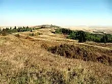 The north-facing slopes and some of the valleys host forests of aspen, lodgepole pine, and white spruce. The remainder of the area is covered by mixed grass prairie, with fescue prairie in higher areas. Wildflowers include prairie crocus, three-flowered avens, lupine, blue bells, and prairie rose.[13][14][15] There are fourteen species of orchids, including the Venus's slipper orchid and the striped coralroot orchid, which are found primarily in wooded areas and along the banks of springs and streams.[13]