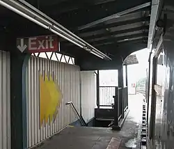 On the north end of each platform, a single staircase leads to a landing outside of a now closed station house. On the Queens-bound platform, a single exit-only turnstile provides exit from the system and a street stair perpendicular to the line leads to Autumn Avenue, which ends at Jamaica Avenue.[8] The exit on the Manhattan-bound platform was closed, and the street stair was removed.