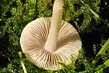 The cap is convex to bell shaped; white, evenly grainy, often with a fringed margin and up to 2 cm in diameter. The gills are white and crowded, with white spores. The stem is white, turning slightly purple when bruised, flaky and grainy.