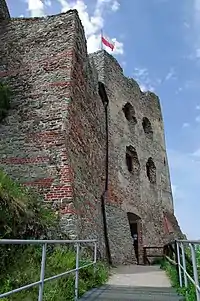 The Czorsztyn Castle stands at the top of the hill nearby Dunajec. According to Jan Długosz, in 1246 the owner of the castle was Piotr Wydżga.[1] However that theory was never after confirmed by other historians, so the beginnings of castle functioning are dated on 14th century. Large development of the castle took place during the reign of Casimir III the Great. In years 1629–1643, when Jan Baranowski was a starosta of Czorsztyn, the castle was fundamentally rebuilt. In 1651 the Castle was captured by the Goral rebels of the Kostka Napierski Uprising. In 1790 the roof of the castle burned following a lightning strike. Afterwards, the castle was abandoned.