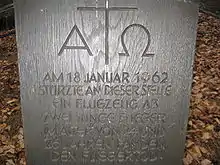 In 1962 an aeroplane of the Royal Air Force crashed on the Dörenberg. Both crew members died. A memorial stone has been laid on the Zigzag Way (Zickzackweg) that runs from the Karlsplatz west of the summit towards the Benno Quarry. It bears the inscription: "Am 18. Januar 1962 stürzte an dieser Stelle ein Flugzeug ab. Zwei junge Flieger im Alter von 24 und 26 Jahren fanden den Fliegertod." ("On 18 January 1962 an aircraft crashed at this spot. Two young airmen - 24 and 26 years old - died an airman's death.") The memorial tablet stands below the first bend on Zigzag Way.