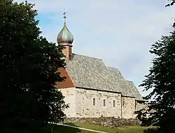 Dønnes Church was probably built here at the request of Paul Vågaskalm who was governor of Alstahaug. It was built on the site of an older church sometime between 1200 and 1300. The characteristic onion dome was added in 1866. The church organ, built by Paul Christian Brantzeg, was installed in 1866.