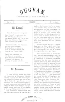 Dúgvan (Faroese pronunciation: [ˈdɪgvan], 'The Dove') was a Faroese monthly newspaper. It was published from January 1894 to 1928[1] primarily in Danish (with some Faroese),[2] with the subtitle afholdsblad for Færøerne 'temperance newsletter for the Faroe Islanders'. A new newspaper with the same name and purpose was also published from 1941 to 1942 in Faroese.[3]