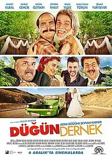 Düğün Dernek (translated as "Wedding Association") is a Turkish comedy film produced in 2013. The film was written by Selçuk Aydemir and produced by BKM. Ahmet Kural, Murat Cemcir, Rasim Öztekin, Devrim Yakut and Barış Yıldız star in the film. The plot of the movie is about Ismail's (who lives in Sivas) efforts to help his son Tarık with his wedding, and the comedic escapades that ensues from it. The film was released in 258 theaters in Turkey on 6 December 2013. In the first 3 days it was watched by 572,838 people and made ₺5,947,213 in revenue. In the first quarter of 2014, it took the "most watched film of the past 30 years" title from Fetih 1453. The film mostly got good feedback but some of the reviewers thought the chemistry between Murat Cemcir and Ahmet Kural was forced and the move was a slapstick comedy that was hard to be taken seriously.[4]