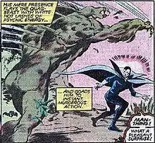 D'Spayre tends to prey on victims who are in despair, using their fear and despair to strengthen himself. He terrorizes Scott Summers and Lee Forrester after Lee's father committed suicide, but is defeated by Summers who resists D'Spayre's illusions and finds resolve in the memory of Jean Grey. This resolve fuels the creature known as Man-Thing who attacks D'Spayre and D'Spayre flees.[7] He then attacks Doctor Strange when Strange is feeling distraught over separation from his girlfriend Clea, but Strange defeats D'Spayre as well, the first of many battles between the two of them. The Dweller-in-Darkness also menaces D'Spayre at this time.[8] He later impersonated Dakimh in a vain attempt to drive Doctor Strange into despondency.[9]