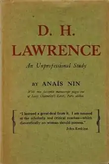 D. H. Lawrence: An Unprofessional Study was Anaïs Nin's first book in print, published by Edward W. Titus in Paris, 1932.[1] The original edition saw 550 copies, and was relatively well received in the literary community. It is a study of the works of her literary hero D. H. Lawrence. The book is notable because it was published at a time when many critics were turning their backs on Lawrence. At the time, it was virtually unheard of for a woman to praise Lawrence, a man whose works had been very controversial, and in several cases, banned for their sexual content.