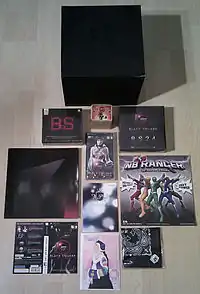 The limited edition is delivered in a package called DJMax Portable Black Square Premium Limited case which has a magnet-based door mechanism. It contains a retail version of the DJMax Portable Black Square PSP game, an original soundtrack which consists of four audio CDs, an art book called Illusion: DJMAX Metro Project Visualization Book containing notes about the development of the game, graphical art and credits with pictures of every developer. The package also has small portable speakers, a Black Square themed bandana, a 2009 new year's card, and a Son of Sun Special Gift which consists of plant seeds and a cup. The package also has a few other items included although they aren't mentioned in the product description.[6] These additional items are a TECHNIKA IC Card: Black Square Edition, a Black Square limited package cover and a NB Ranger 3D paper figure.
