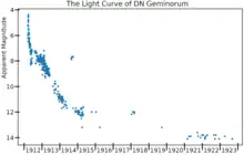 DN Geminorum or Nova Geminorum 1912 was a classical nova which lit up in 1912 in the constellation Gemini. It was discovered by Norwegian variable star observer Sigurd Einbu[3] on March 12, 1912 before reaching peak brightness, which allowed early-stage spectra to be collected by Yerkes Observatory.[5] The nova reached a maximum brightness of around 3.5 mag before declining,[6] which means it was visible to the naked eye. Its brightness decreased over the following 36 days by 3 magnitudes as it gradually faded from sight. The light curve saw two maxima a few months after the outburst, along with strong oscillations.[6] Today its brightness is visual magnitude 15.5.[2]