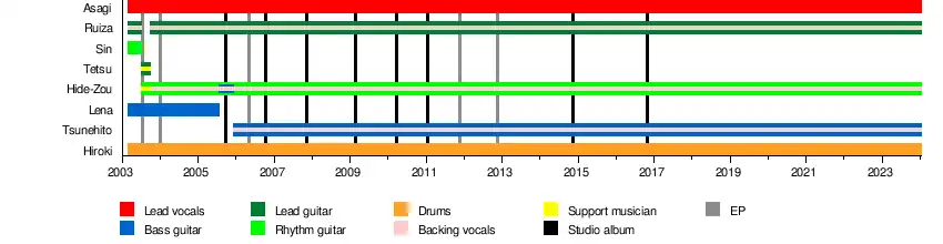 In 2023, the band teamed up with Moi dix Mois, Versailles and Matenrou Opera for the four-date Japanese Visual Metal tour between September 22 and October 2.[39] The four bands collaborated on the song "Kyōsōkyoku ~Tanbinaru Kettō~", which was released as a single credited to the JVM Roses Blood Symphony.[40]