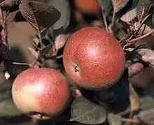 'Dabinett' probably dates from the early 1900s, when it was found by William Dabinett growing as a wilding (a natural seedling) in a hedge at Middle Lambrook, South Petherton, Somerset.[1] The exact genetic makeup of Dabinett is unknown, though one 'parent' was probably the Chisel Jersey apple, a similar late "bittersweet" variety. The variety became very popular and was widely planted across the south-west of England.