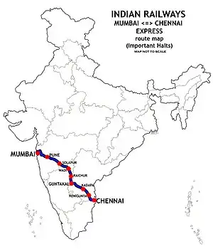 It operates as train number 12163 from Lokmanya Tilak Terminus to Chennai Central and as train number 12164 in the reverse direction serving the states of Maharashtra, Karnataka, Andhra Pradesh and Tamil Nadu. The train now departs from Lokmanya Tilak Terminus from 1 July 2020 and arrives at Chennai Central.
