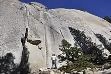 The dome is popular with rock climbers and has several multi-pitch slab and crack climbs. Two of the earliest and best known are West Crack and Crescent Arch. West Crack, first climbed by Frank Sacherer in June 1963 is a 5 pitch YDS 5.9 which for 400 feet follows a continuous crack.[2][5] Crescent Arch was first climbed with occasional aid by Layton Kor and Fred Beckey in June 1965, and first free climbed by Bob Kamps and TM Herbert soon after. The climb is a 6 pitch YDS 5.9+ (modern 5.10a) and ascends corner and crack system in a large open book.[2][6]