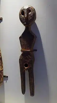 The statue is made of Scots pine and stands 18 inches (46 cm) high. It has two legs but no arms; hips and buttocks narrowing to a waist and then broadening to shoulders; and a rounded head. There are straight markings cut across both legs. A hole in the pubic region can be interpreted as indicating a female, but with the insertion of a phallic peg (now lost) would indicate a male. There appears to be damage to the left eye: while there may not be a direct link, the damage is similar to Odin's sacrifice of an eye at Mímir's Well in return for wisdom in Norse myth; Coles (p.332) suggests "one-eyed Odin can be noted as possible successor to the wooden figures of ambiguous sex and odd left eyes, if no more".