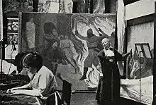 It was, however, tapestry which became Olrik's main interest. Already in 1986, she created a woven picture on the basis of a cartoon created by Johanne Frimodt. In 1900, while on a study trip around Europe, she leart the art of tapestry weaving and creation, especially in Rome and Florence.[2] In 1902, she became head of the workshop for weaving tapestries in Copenhagen's City Hall. There, on the initiative of her brother Axel, she began to decorate the city hall with tapestries celebrating the 80th birthday of Lorenz Frølich. They were based on his illustrations of Frabricius' History of Denmark (1852).[3] The assignment lasted a full 18 years. She also undertook tapestry repair and renovation work for the National Museum, Copenhagen University and several manor houses.[1] Olrik became one of the leading lights in the revival of Danish interest in the art of tapestry. She also trained a number of students to assist her in her work and follow in her footsteps.[2]